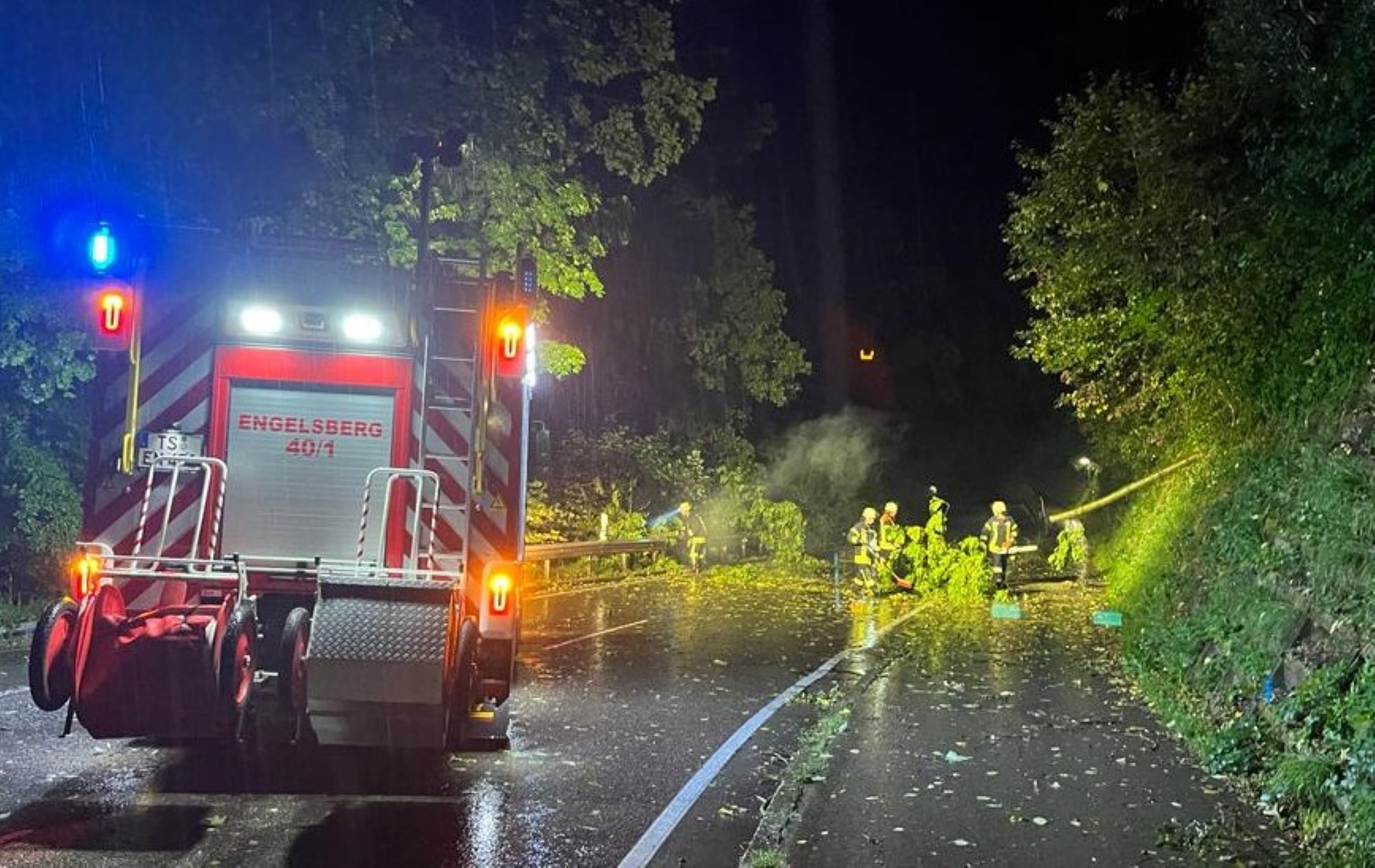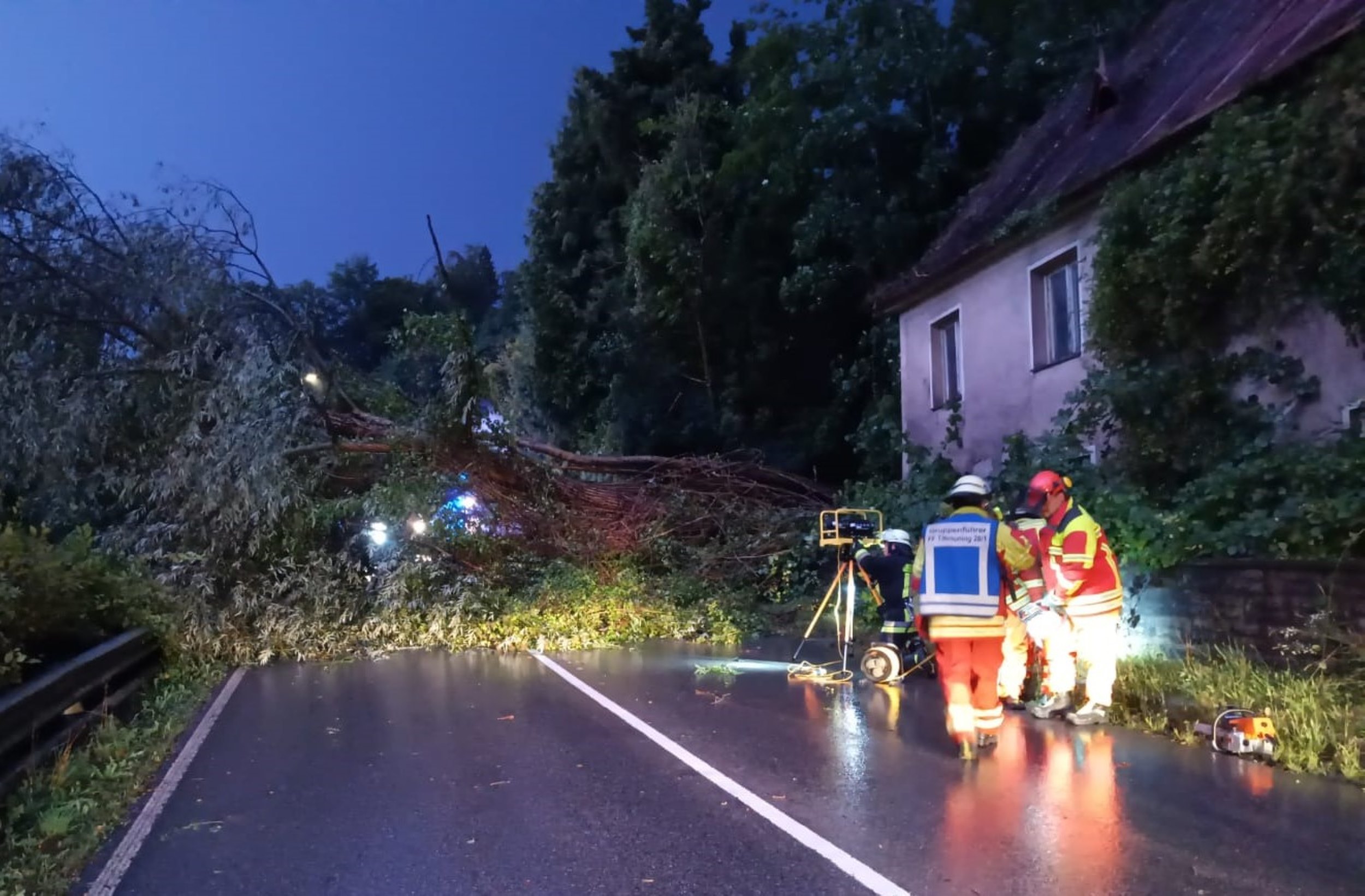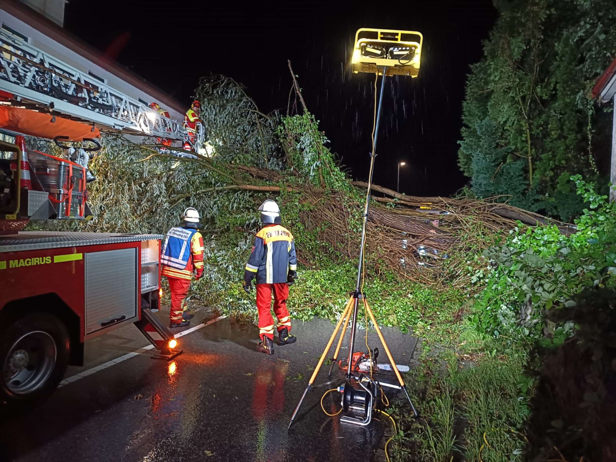 Hans-Peter Heimbach von der Feuerwehr Trostberg meldet, dass die Unterführungen in der Tittmoninger und Pallinger Straße voller Wasser gelaufen waren und dort jeweils Autos stecken blieben. „Einen PKW konnte die Feuerwehr selbst herausziehen, beim Zweiten war ein Abschleppdienst nötig“, so der Kommandant. Um 1:42 Uhr mussten die Einsatzkräfte noch zu einem Wassereintritt in einem Supermarkt ausrücken. Die Feuerwehrleute in Engelsberg wurden zu insgesamt vier Einsätzen gerufen. Im Einsatzgebiet blockierten jeweils Bäume die Fahrbahn und mussten beseitigt werden. „Rund eineinhalb Stunden waren wir im Einsatz“, sagte Kommandant Georg Wimmer.