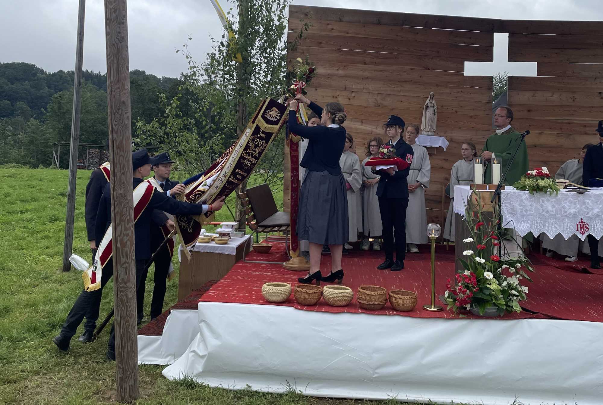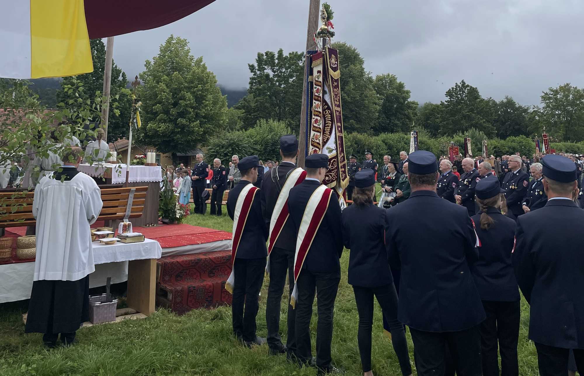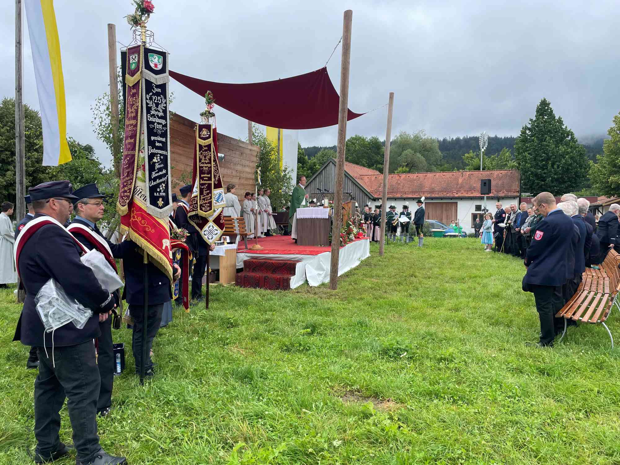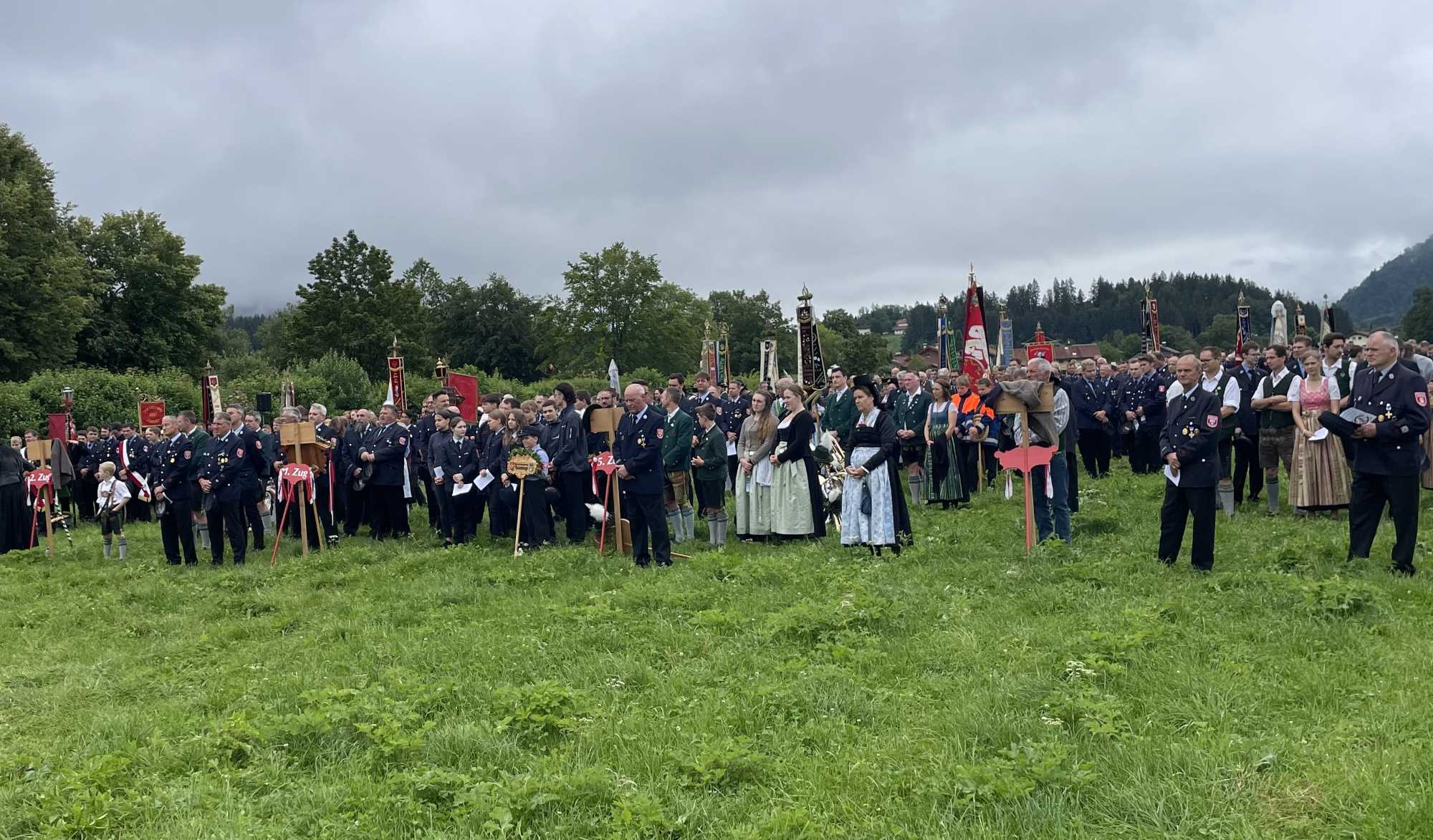 Rund 35 Vereine beteiligten sich am Festsonntag. In den Vormittagsstunden formierte sich der Kirchenzug, um gemeinsam einen Freiluftgottesdienst zu feiern. Die Heilige Messe zelebrierte Pfarrer Thomas von Rechberg der unter anderem die beiden Erinnerungsbänder segnete. Diese zieren fortan die Fahnen des Festvereins sowie des Patenvereins aus Holzhausen