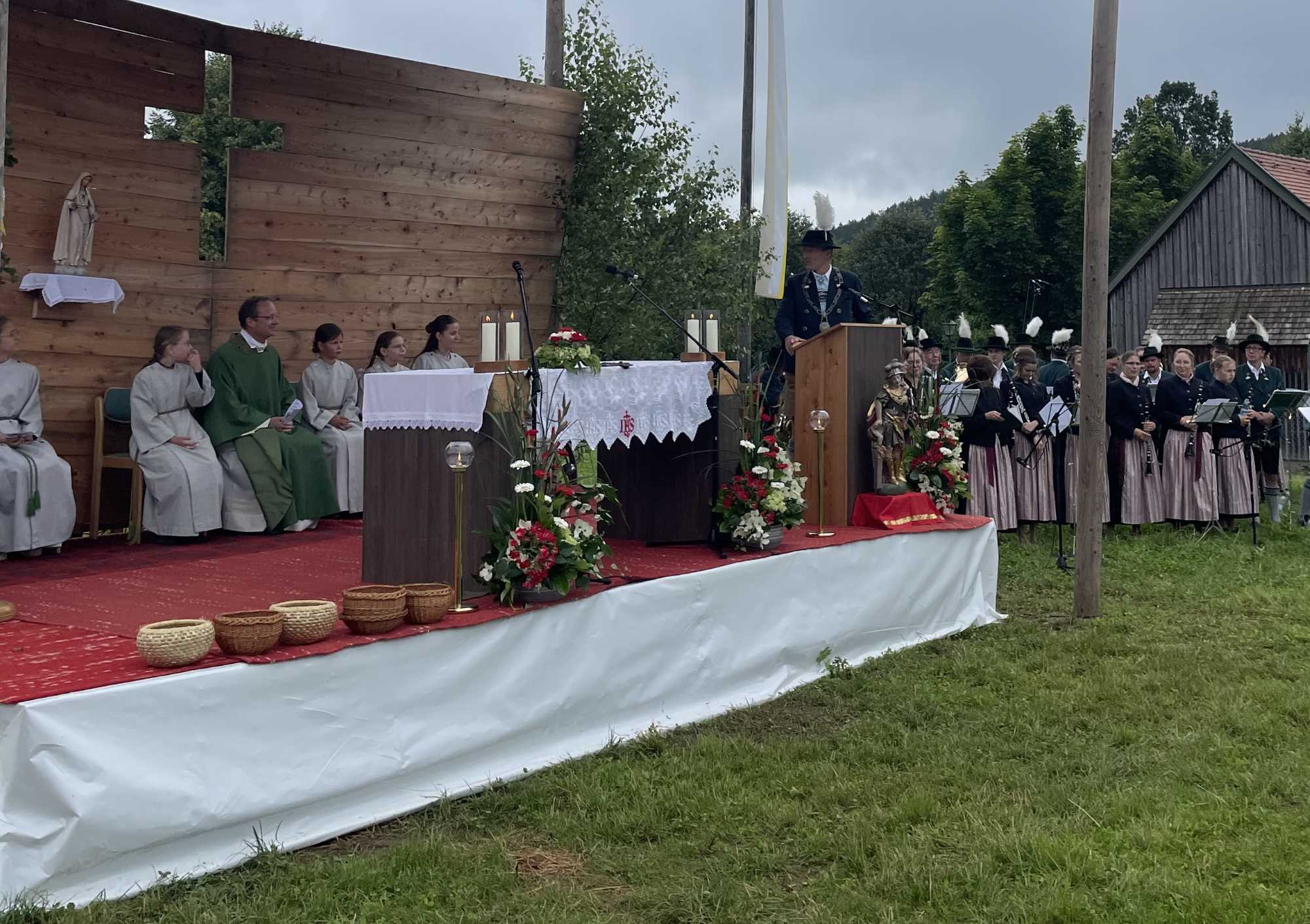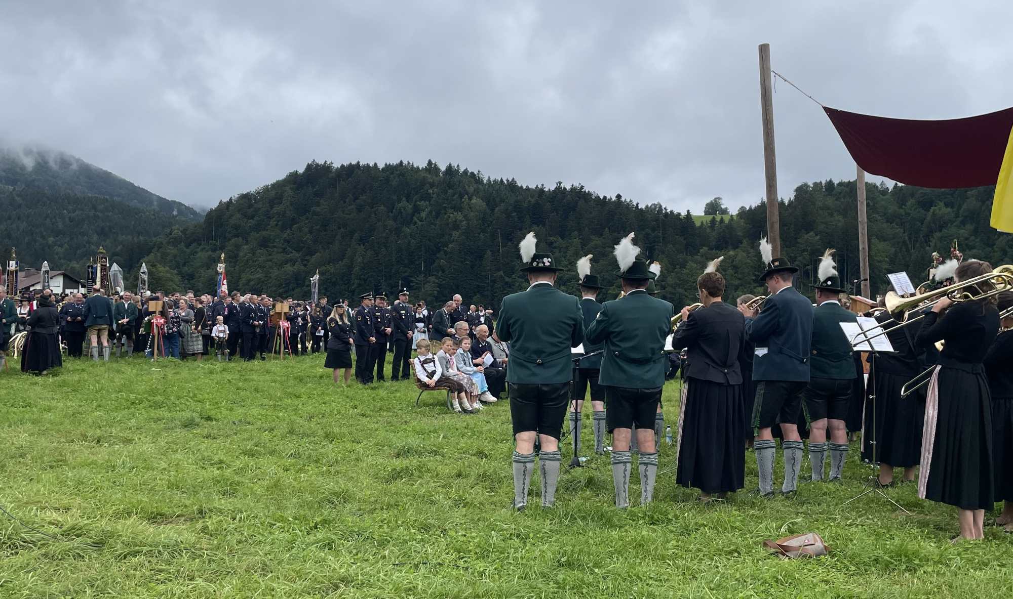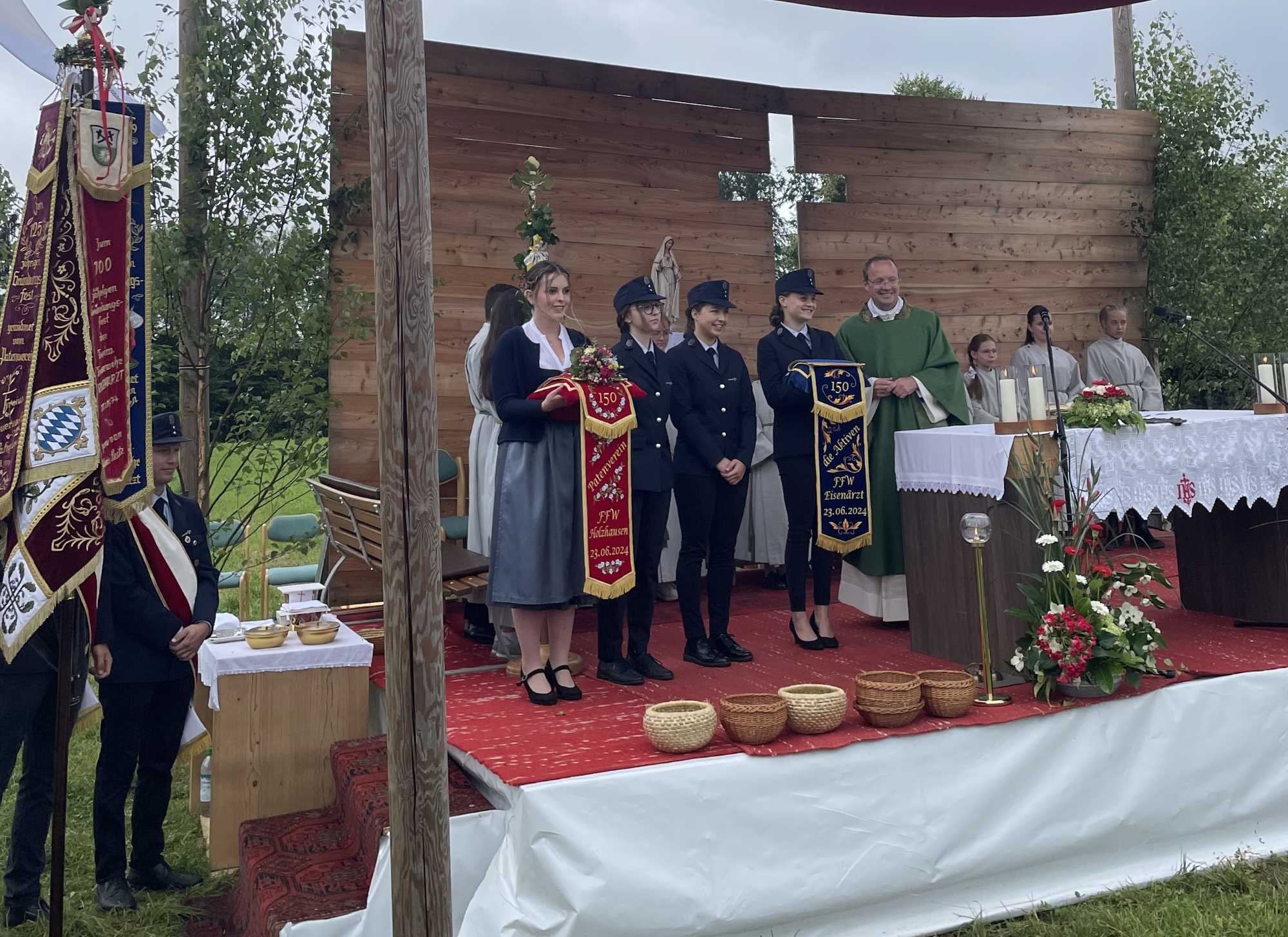 Rund 35 Vereine beteiligten sich am Festsonntag. In den Vormittagsstunden formierte sich der Kirchenzug, um gemeinsam einen Freiluftgottesdienst zu feiern. Die Heilige Messe zelebrierte Pfarrer Thomas von Rechberg der unter anderem die beiden Erinnerungsbänder segnete. Diese zieren fortan die Fahnen des Festvereins sowie des Patenvereins aus Holzhausen