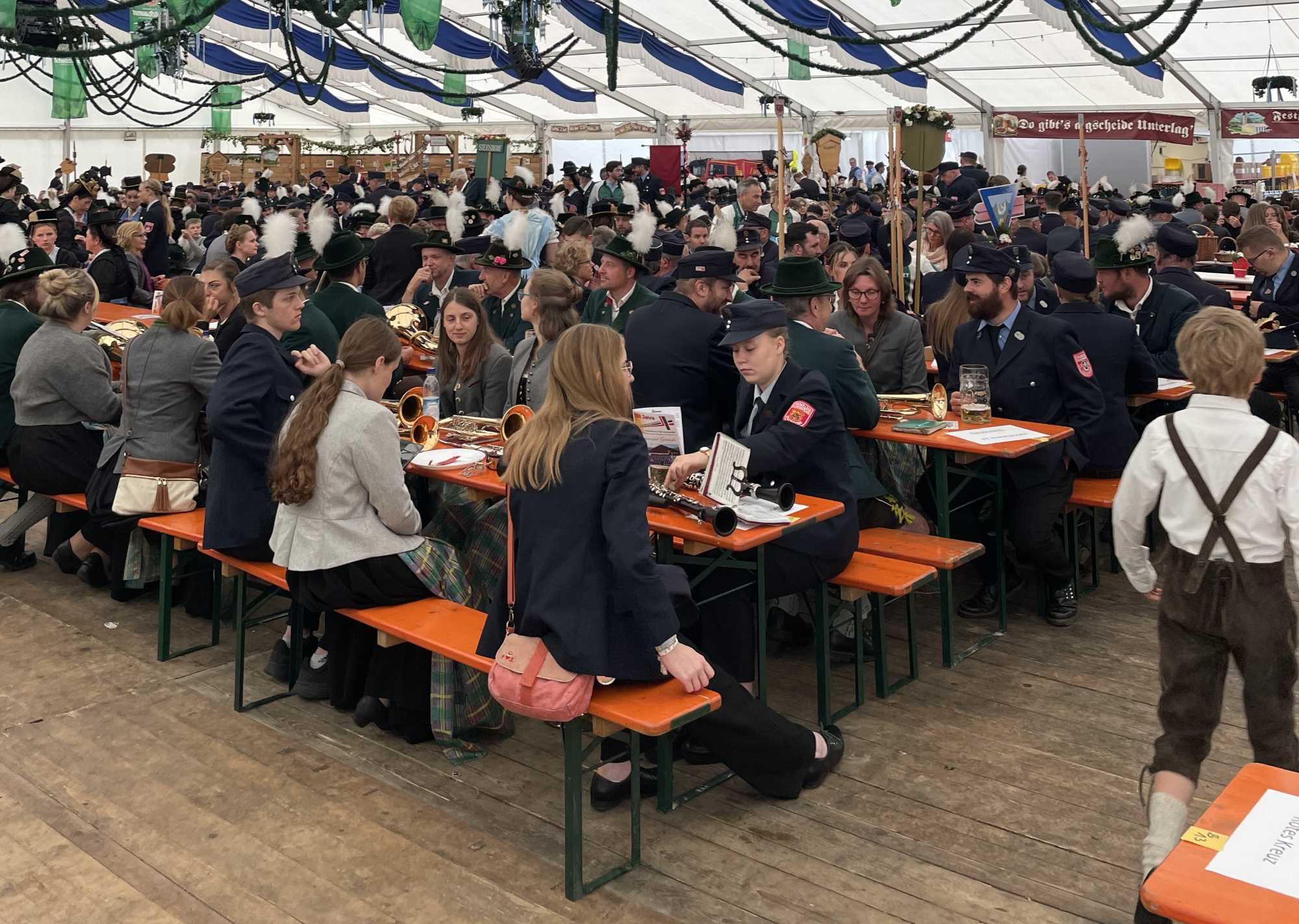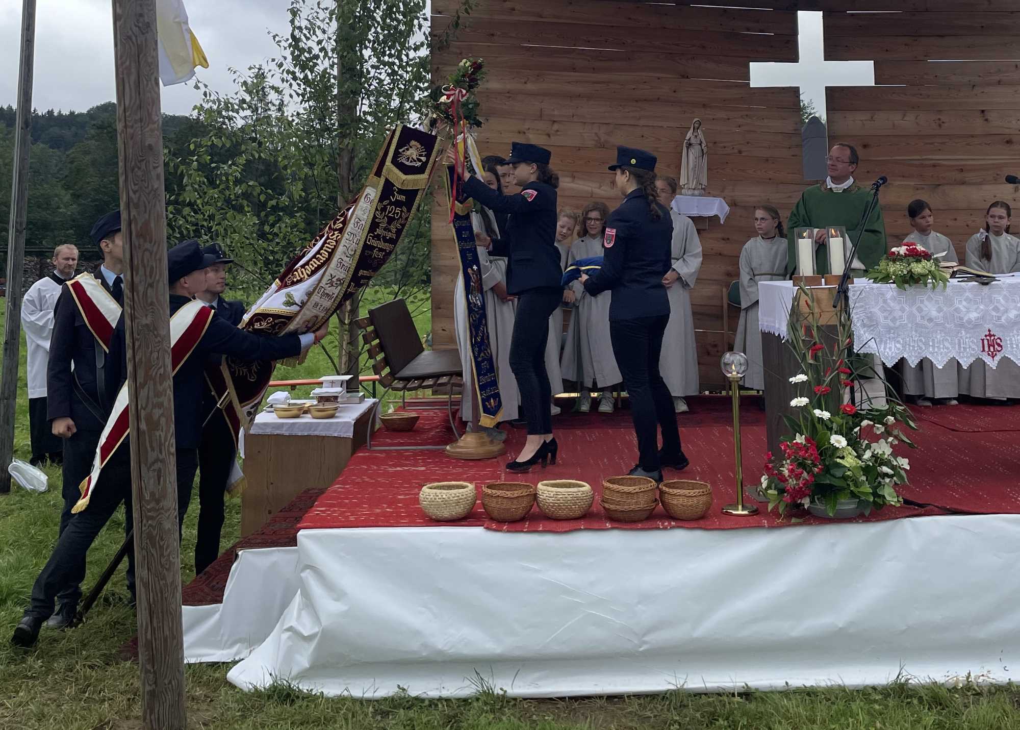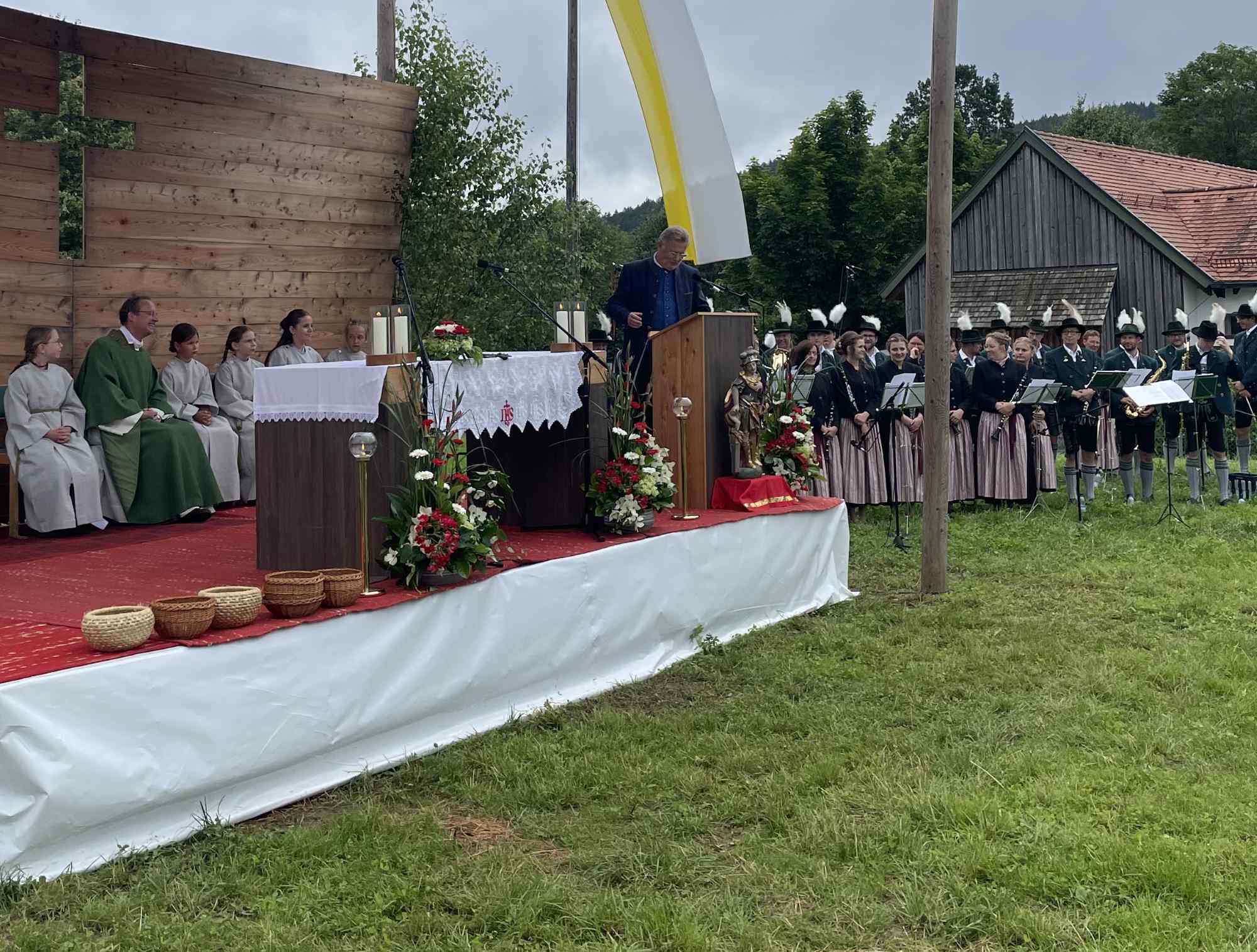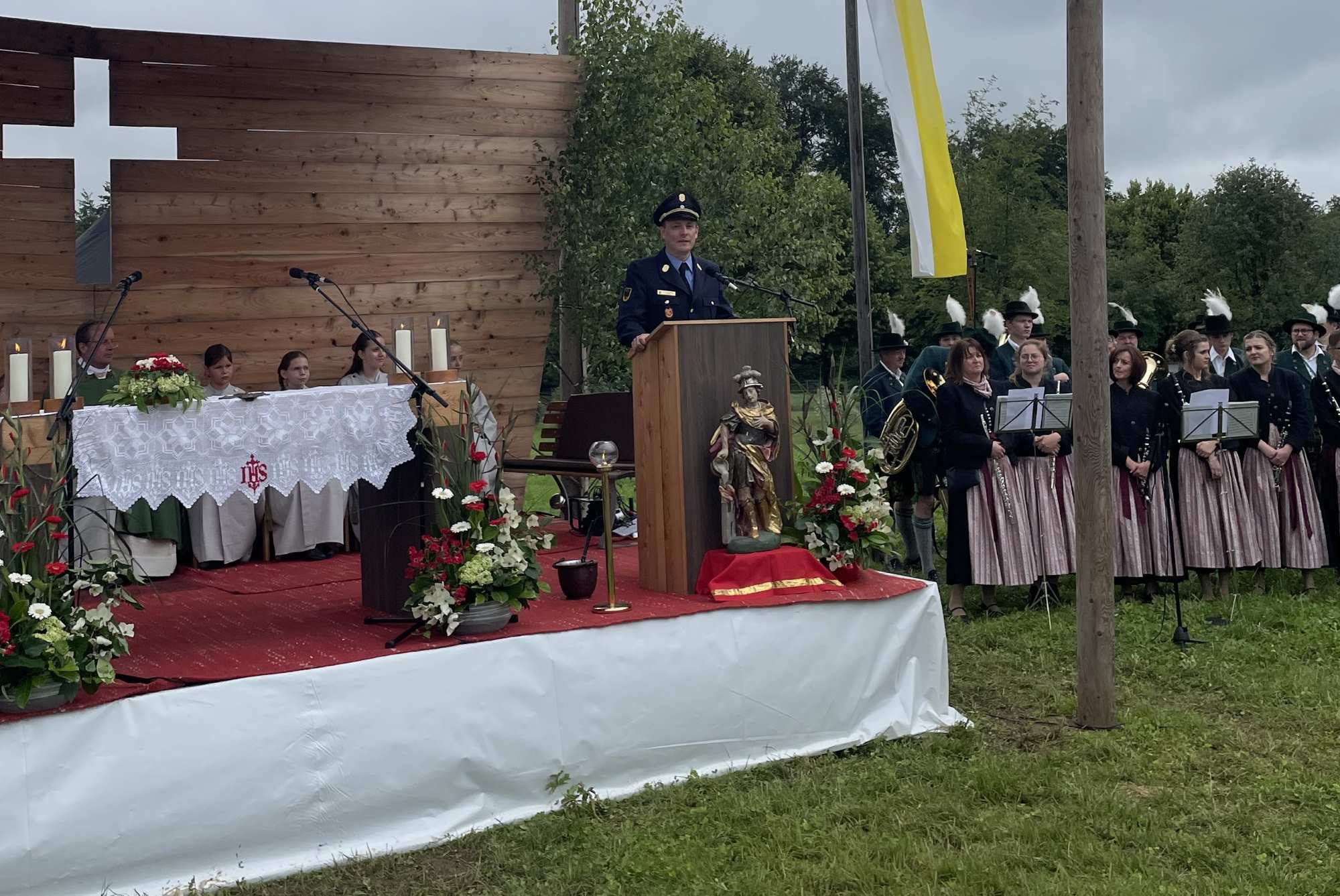 Rund 35 Vereine beteiligten sich am Festsonntag. In den Vormittagsstunden formierte sich der Kirchenzug, um gemeinsam einen Freiluftgottesdienst zu feiern. Die Heilige Messe zelebrierte Pfarrer Thomas von Rechberg der unter anderem die beiden Erinnerungsbänder segnete. Diese zieren fortan die Fahnen des Festvereins sowie des Patenvereins aus Holzhausen