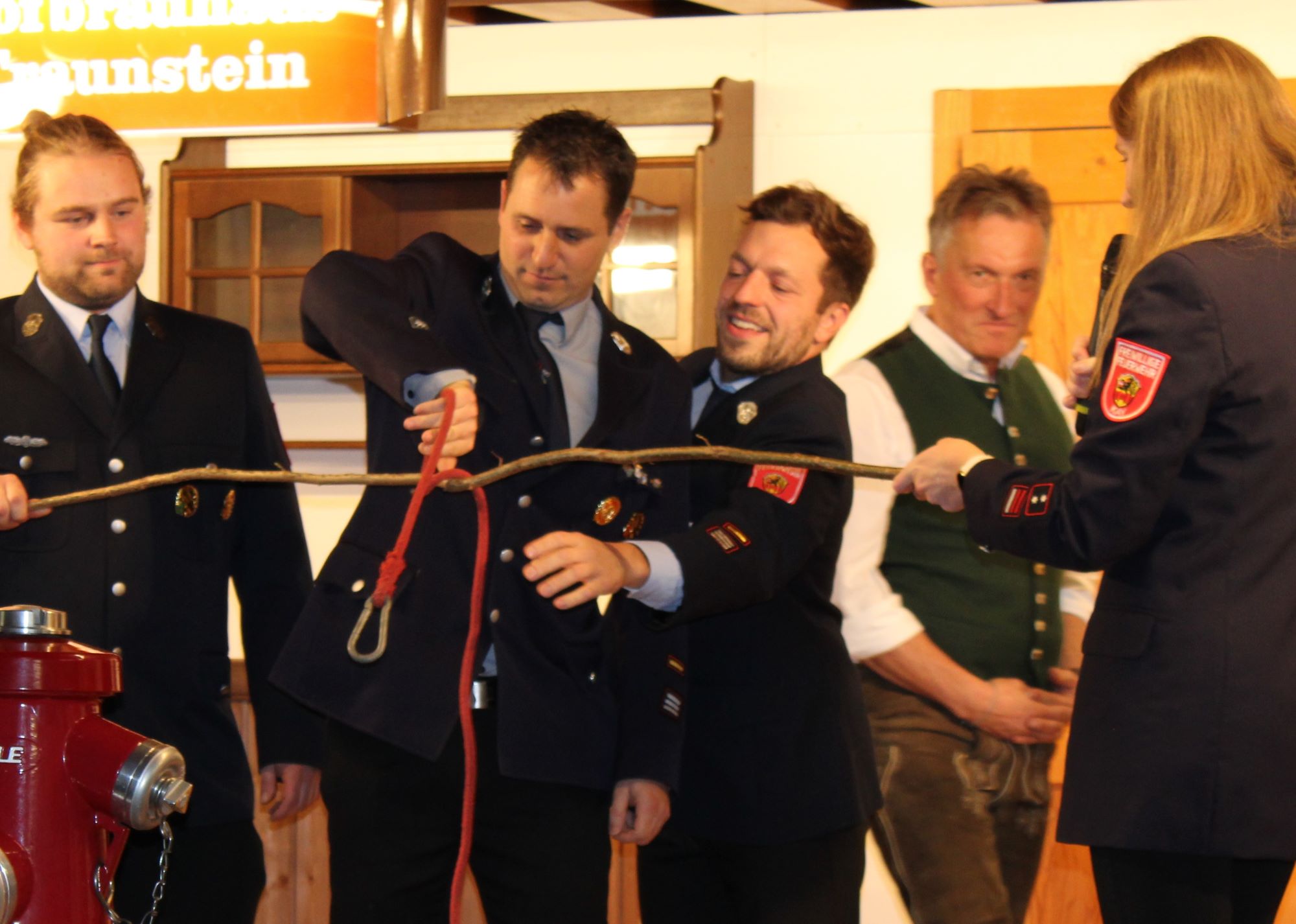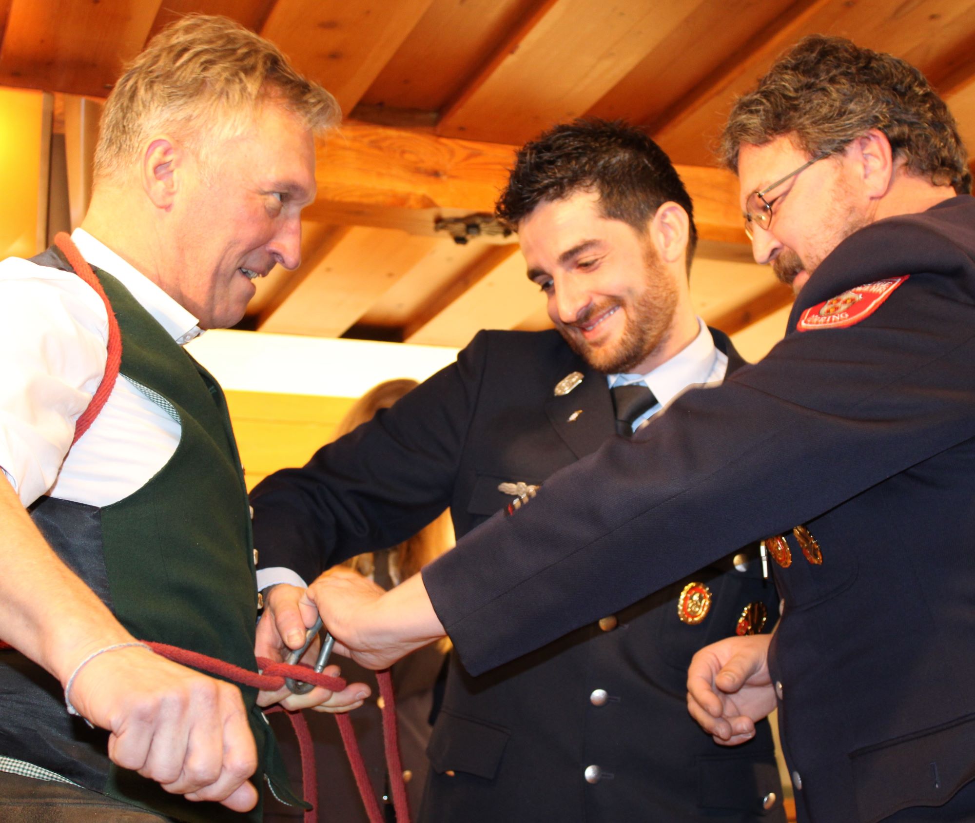 Die Kommandanten beider Feuerwehren kamen ebenfalls „nicht ungeschoren davon“. Sie mussten als gemischtes Doppel „Florian Huber – Andreas Schuhbäck“ und „Wolfgang Eder – Thomas Forster“ ihre Seilkünste bei unterschiedlichen Feuerwehrknoten unter Beweis stellen. Als „Siamesische Zwillinge“, mit der rechten Hand des einen und der linken Hand des anderen war unter anderem ein Rettungsknoten beim Tittmoninger Stadtoberhaupt eine der Aufgabenstellungen. „Gar nicht schlecht“, war dabei von den Zuschauerbänken zu hören und ist sicherlich als „typisch bayerischer frenetischer Jubel“ für die erfolgreich erledigten Aufgaben zu werten war.