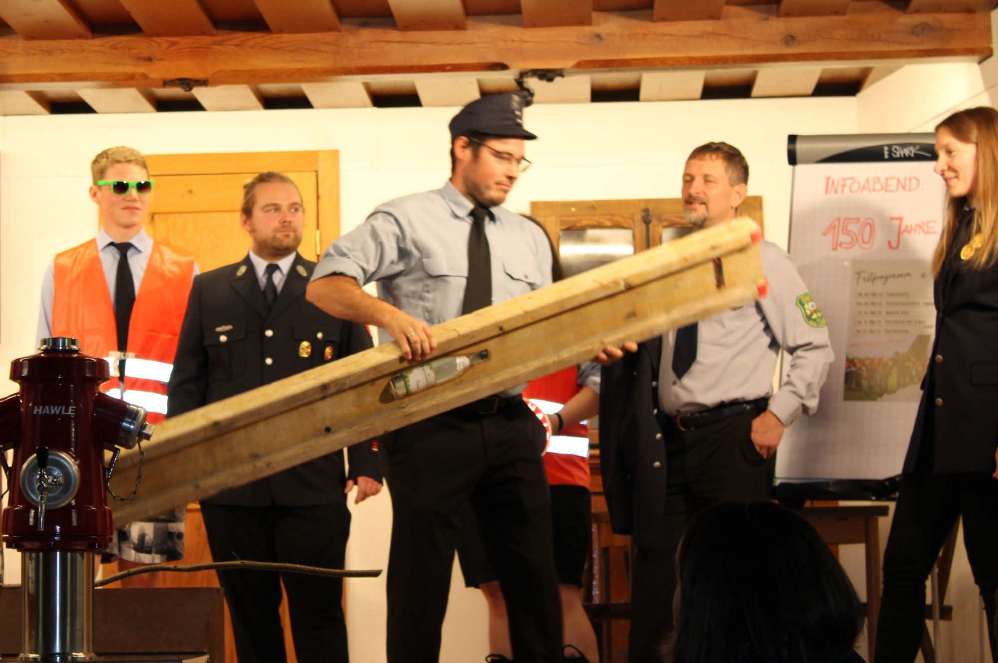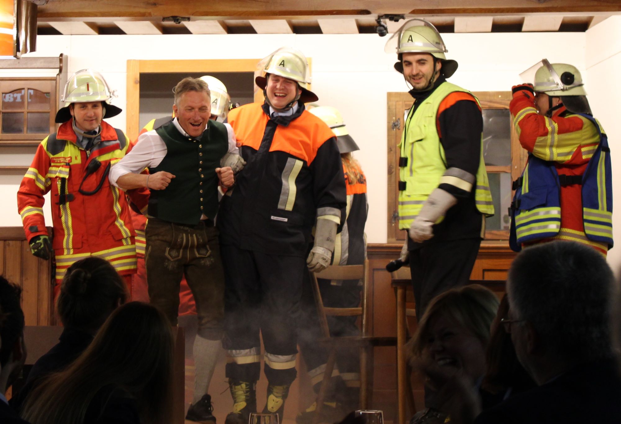 Bei den Wortgefechten, wer von beiden Vereinen den Saal des Gasthauses für sich in Anspruch nehmen durfte, blieb bei den Gästen vor lauter Lachen bereits kein Auge mehr trocken. Das „zähe Ringen um das Rederecht“ wurde jäh durch das Aufheulen einer Sirene unterbrochen. Es dauerte nicht lange, dann standen die Aktiven beider Wehren „in voller Montur im Saal“ und wollten jeweils als Erstes das „vermisste Gemeindeoberhaupt retten“ – was glücklicherweise innerhalb kurzer Zeit in einer „gemeinsamen und waghalsigen Rettungsaktion“ gelungen ist.