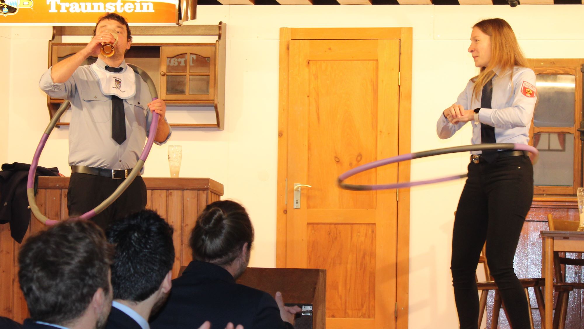Um „die Vorherrschaft im Saal“ und somit das Rederecht endgültig zu ermitteln, ließen sich die beiden Festleiter auf einen sportlichen Wettstreit ein und holten mit Michael Dandl (Törring) und Franz Lechner (Kay) „zwei geeignete“ Mitglieder auf die Bühne. Ihre Aufgabe, sie sollten mit einem kreisendem Hula-Hopp Reifen um den Bauch ein Weißbier trinken und wer als erstes fertig ist, darf den Abend zur Vorstellung des Programms für sich in Anspruch nehmen. „Unterm Strich“ verlief die Vorstellung mit mäßigem Erfolg, da bei beiden Sportlern der Reifen einfach nicht „Hula-Hoppen“ wollte.