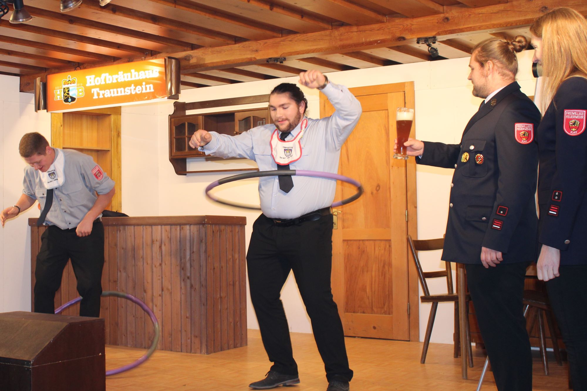 Besser gemacht haben es die Vorstände Anna Rauschecker aus Kay sowie ihr Amtsbruder Christian Baumgartner von der Feuerwehr Törring. Während die Kayer Vertreterin das Publikum mit ihren Hula-Hopp Künsten begeisterte, hing sich der Törringer Vertreter den Reifen entspannt über die Schulter und hat genüsslich den „feinen Hefe Saft“ verzehrt. Ihr gemeinsames Fazit, „gemeinsam sind wir eben stark und die Vorstandschaften halten fest zusammen“.