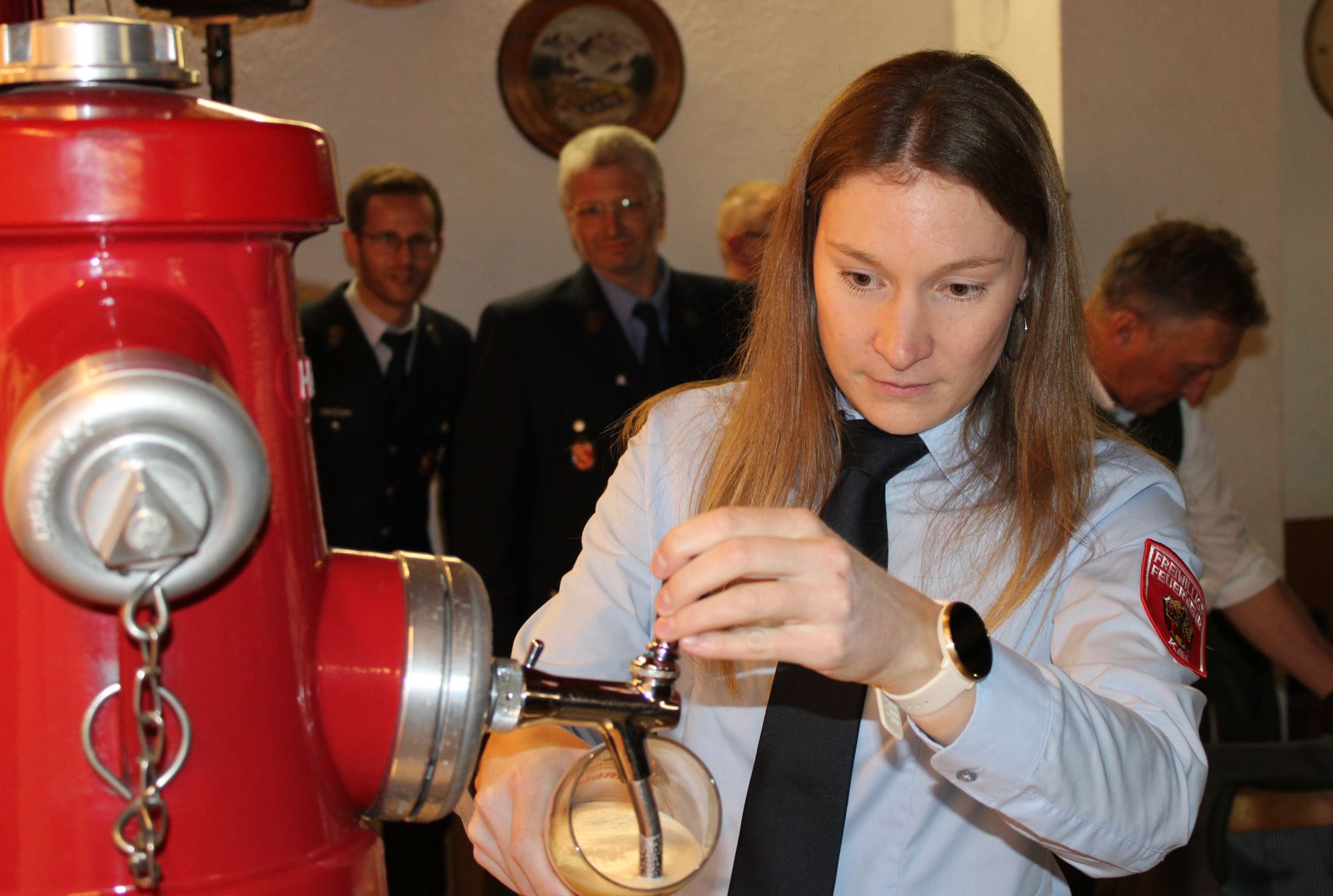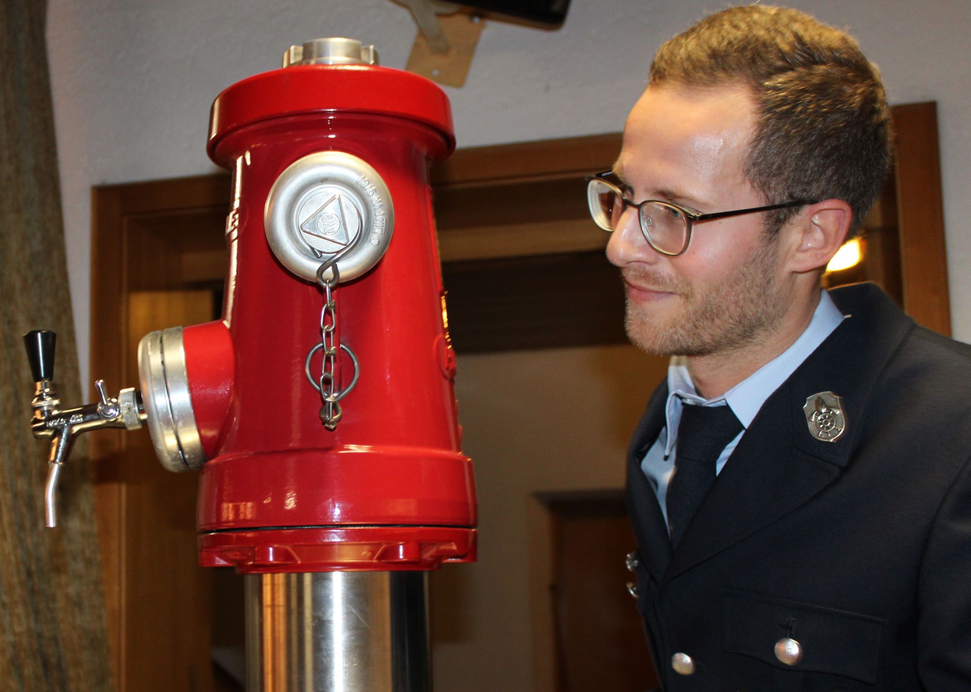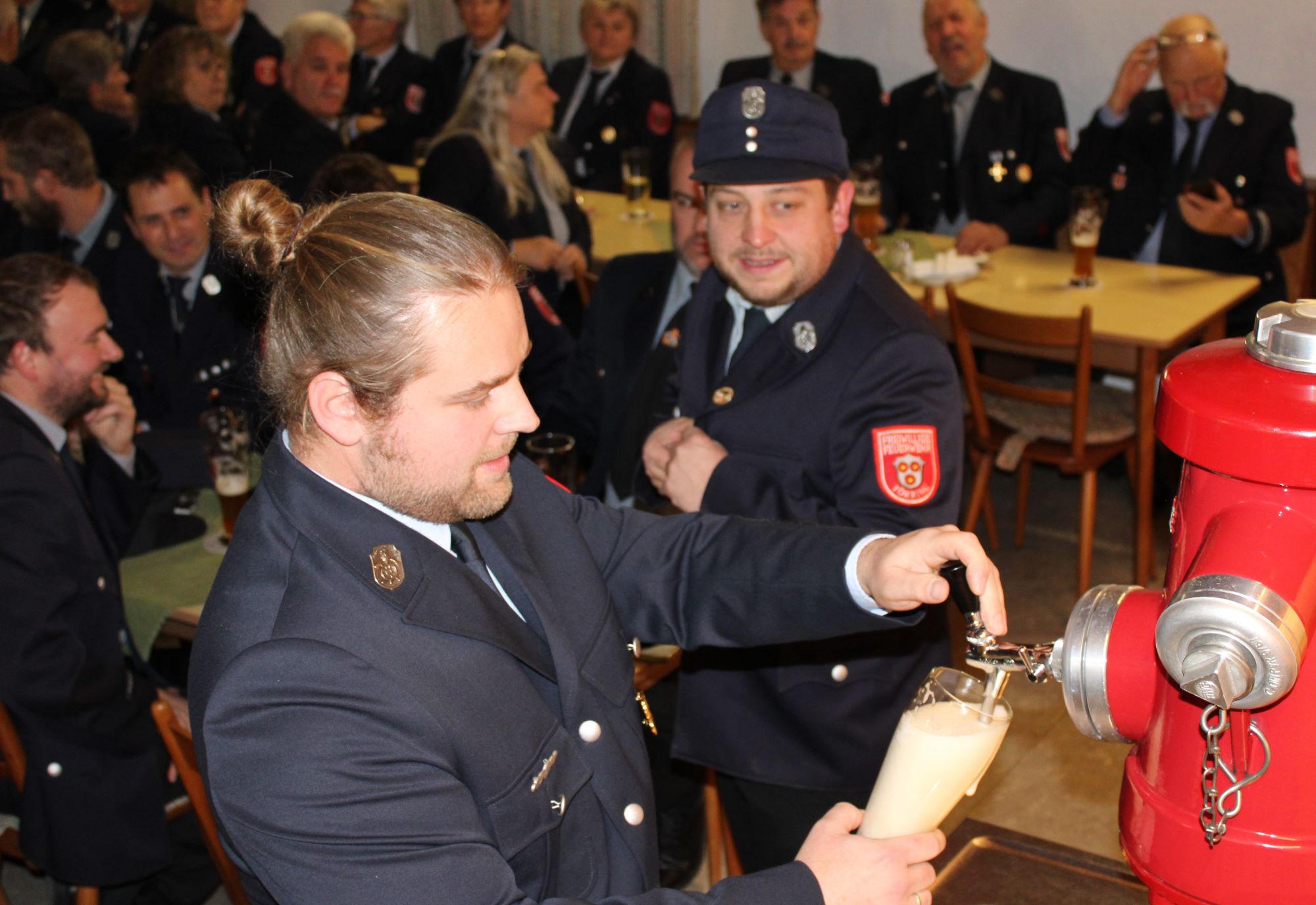 Der Törringer „Konter“ ließ nicht lange auf sich warten, „Koi ist ein Fisch und keine Ortschaft“, so die Behauptung des Törringer Vorstands - was auf der einen Seite des Saals zu frenetischem Jubel, auf der anderen Seite zu lautstarken Protesten führte. Außerdem hatten sie für die Kayer Kameraden eine Wasserwage als „Geschenk“ dabei, „damit ihr es schafft, zumindest ein Plakat von eurer Festwoche gerade aufzuhängen“, frotzelte Christian Baumgartner. Zur Besänftigung der „aufgeheizten Stimmung“ und um die „Törringer Feuerwehrler wohlwollend zu stimmen“ wurde durch Vertreter der Feuerwehr Kay ein ganz besonderer Hydrant in den Saal geschoben. Anstelle von Wasser floss zur Freude aller Anwesenden Gerstensaft aus dem Hahn.