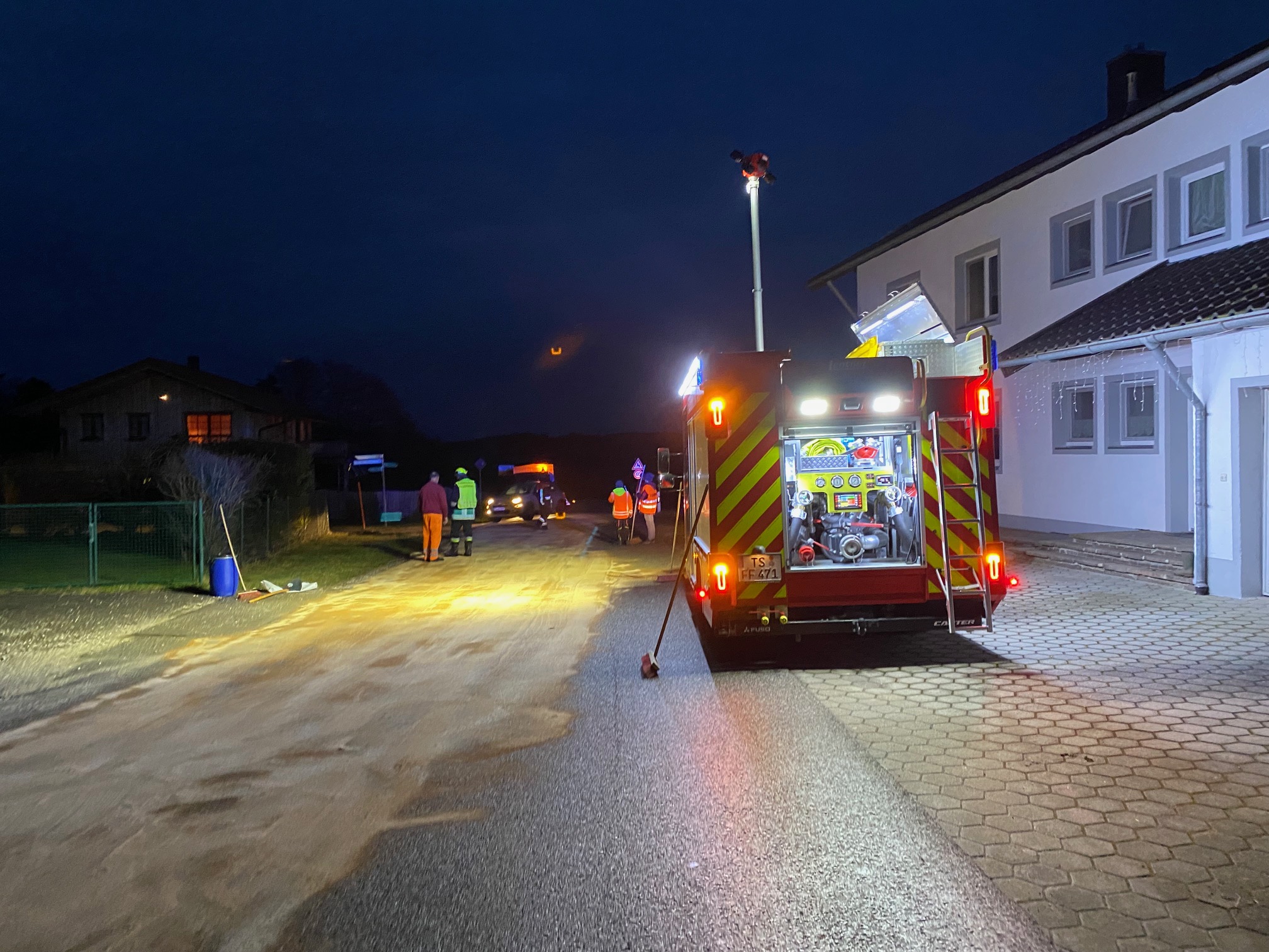 Chieming, Ising. Am frühen Donnerstagabend (8.2.) wurde die Feuerwehr Ising zu einer technischen Hilfeleistung nach Tauernhausen gerufen. Ausgelaufenes Hydrauliköl musste vor dem Versickern im Bankett gesichert und von der Straße entfernt werden. Durch einen knapp dreistündigen Einsatz konnten Auswirkungen auf die Umwelt verhindert werden. Die Straße musste aufwendig gereinigt werden und Teile des Erdreichs durch einen Bagger ausgehoben werden.