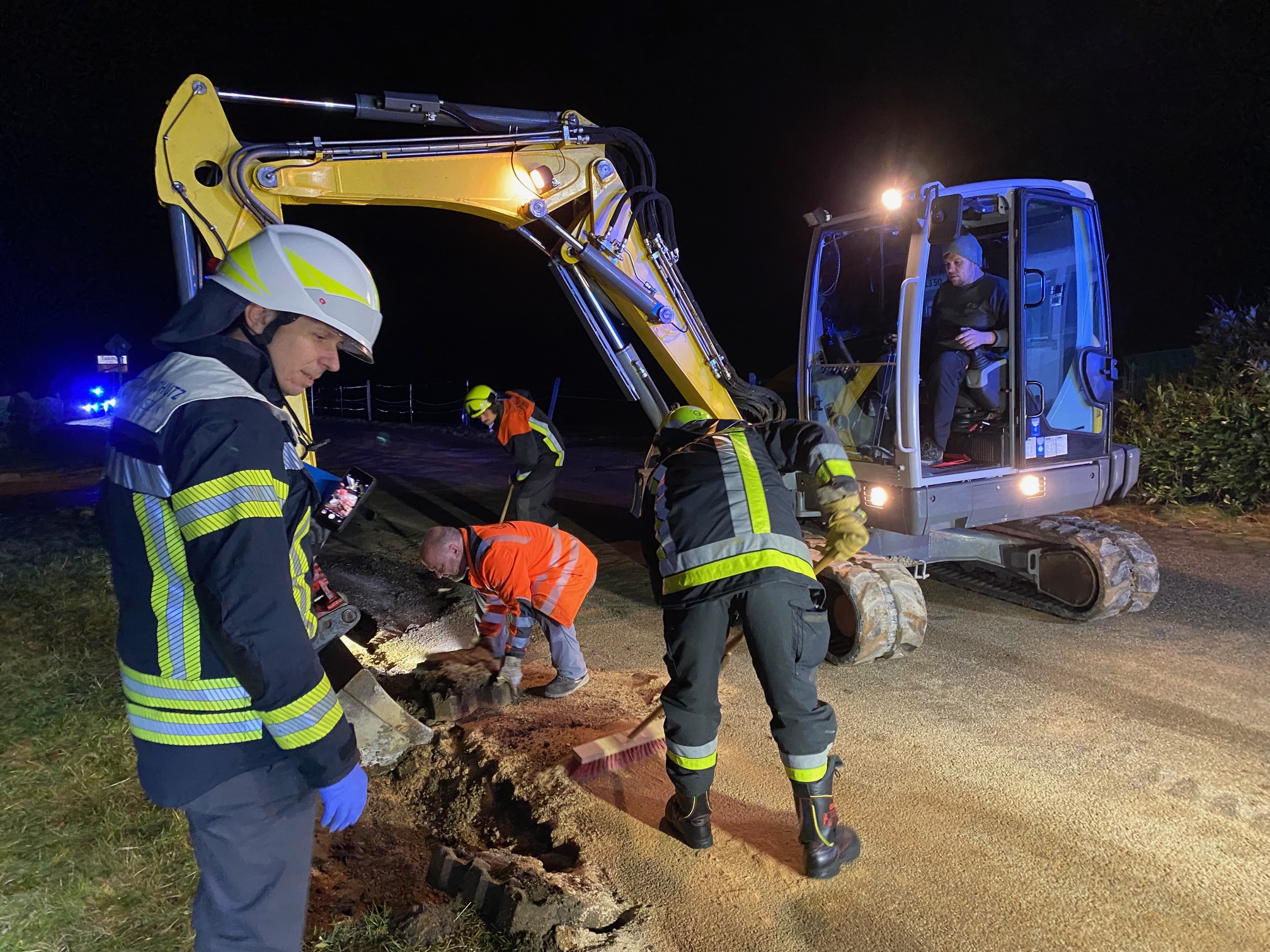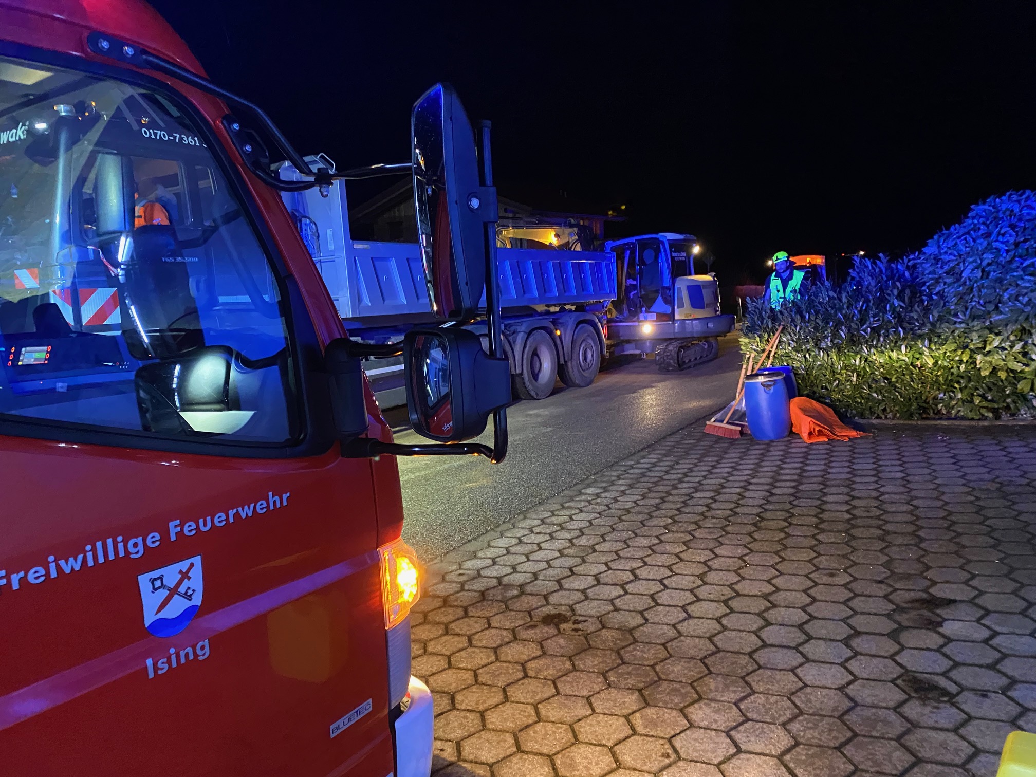 In Abstimmung mit dem Wasserwirtschaftsamt Traunstein sowie Vertretern des Landratsamtes das betroffene Erdreich durch ein angefordertes Baggerunternehmen ausgehoben und zur Entsorgung abtransportiert. Parallel dazu übernahmen neun Einsatzkräfte der Feuerwehr Ising die Verkehrsabsicherung der Kreisstraße, das Ausleuchten der Einsatzstelle sowie die Entfernung der Ölspur. Während der Arbeiten blieb die TS 11 total gesperrt. Gegen 19:45 Uhr konnte die Einsatzstelle an Vertreter des Kreisbauhofes übergeben werden und die Feuerwehr Ising den Einsatz beenden.