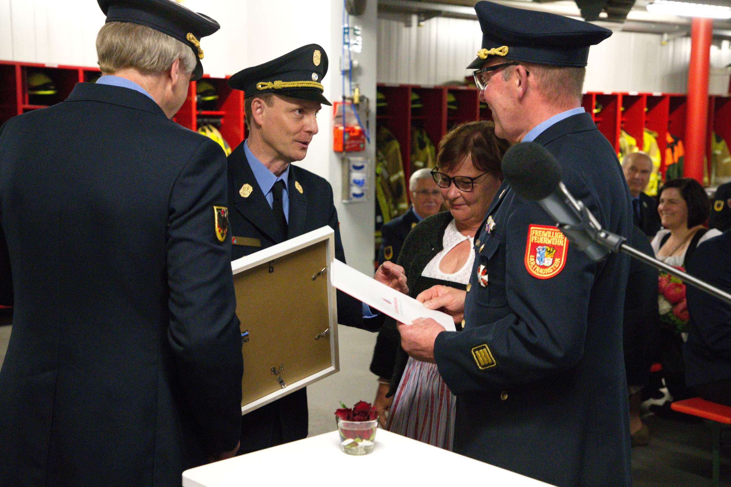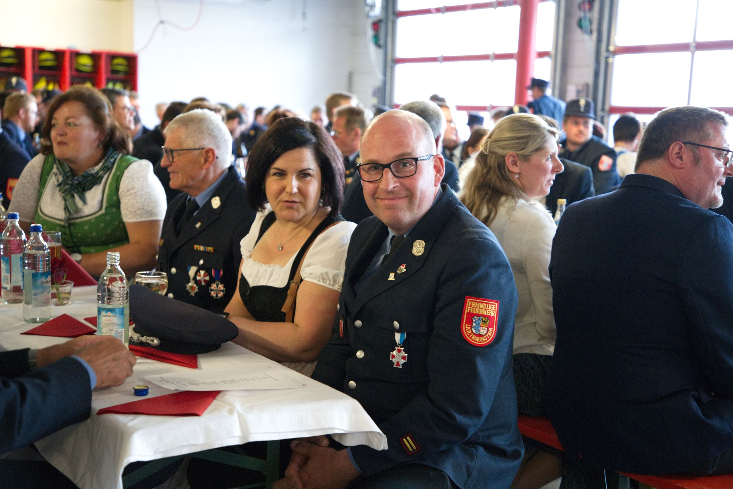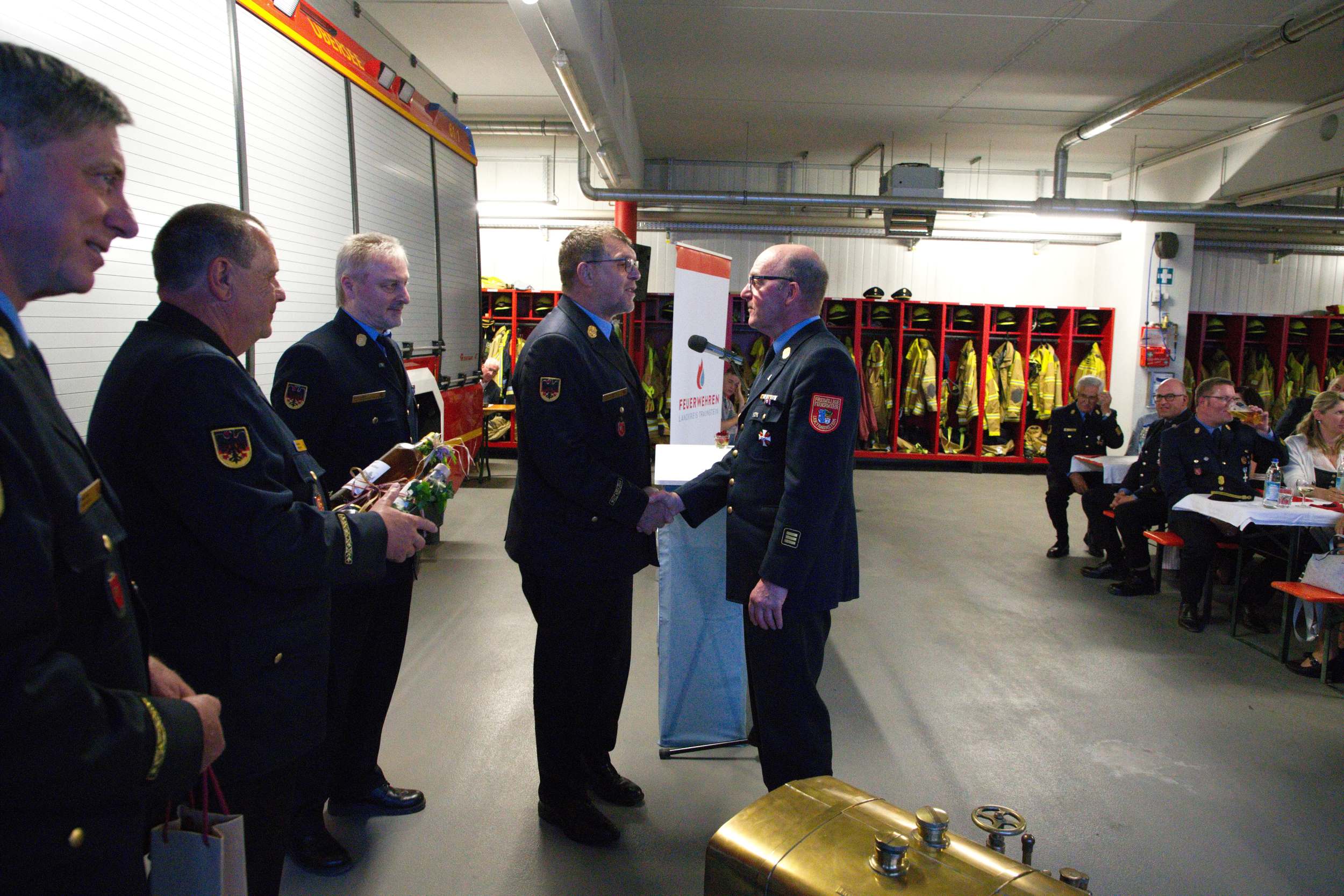 Alexander Fuchs vom Landratsamt Traunstein dankte beiden für die jahrzehntelange gute Zusammenarbeit und erinnerte exemplarisch an Einsätze wie die angebohrte Gasblase in Grabenstätt oder den Ammoniak Austritt in Ruhpolding. „Für die Feuerwehren vor Ort ist es sehr wichtig, dass rund um die Uhr auf eine zusätzliche Stütze zurückgegriffen werden kann und ihr Beide seid solche Stützen gewesen“, sagte er unter dem Applaus der Gäste. Eine Abordnung der Kreisbrandinspektion Rosenheim war ebenfalls nach Übersee angereist, um den beiden Ehrengästen ihren Dank für die langjährige gute Zusammenarbeit auszusprechen.